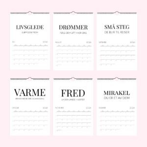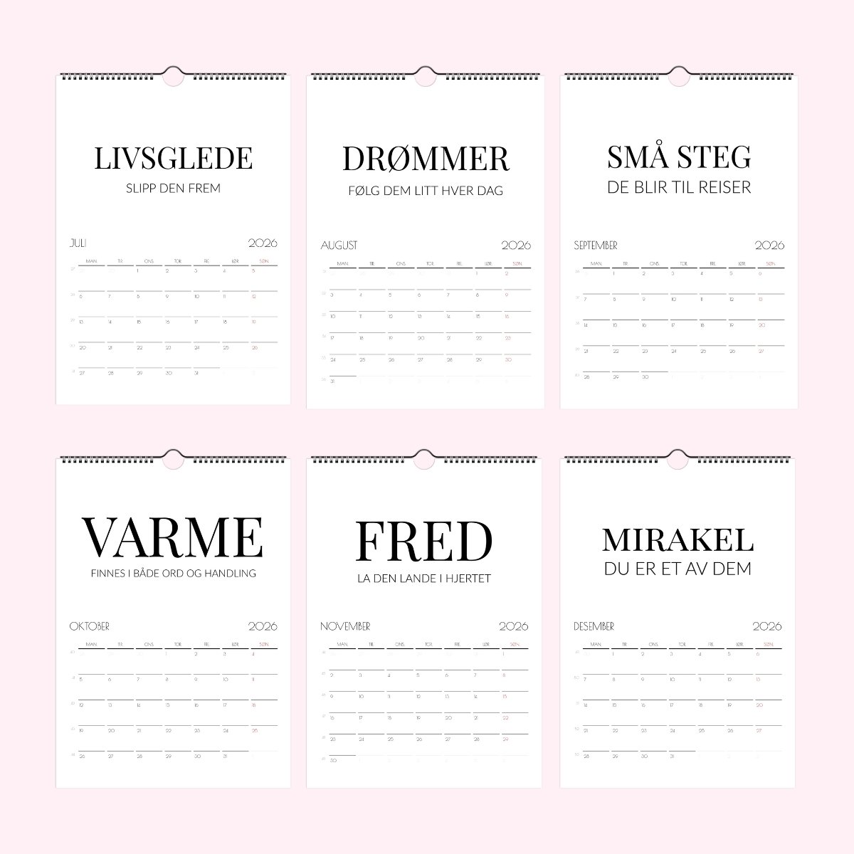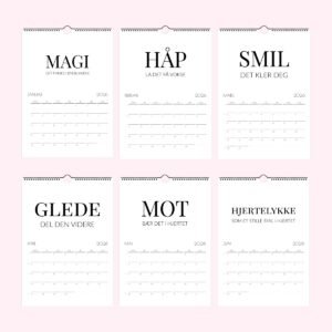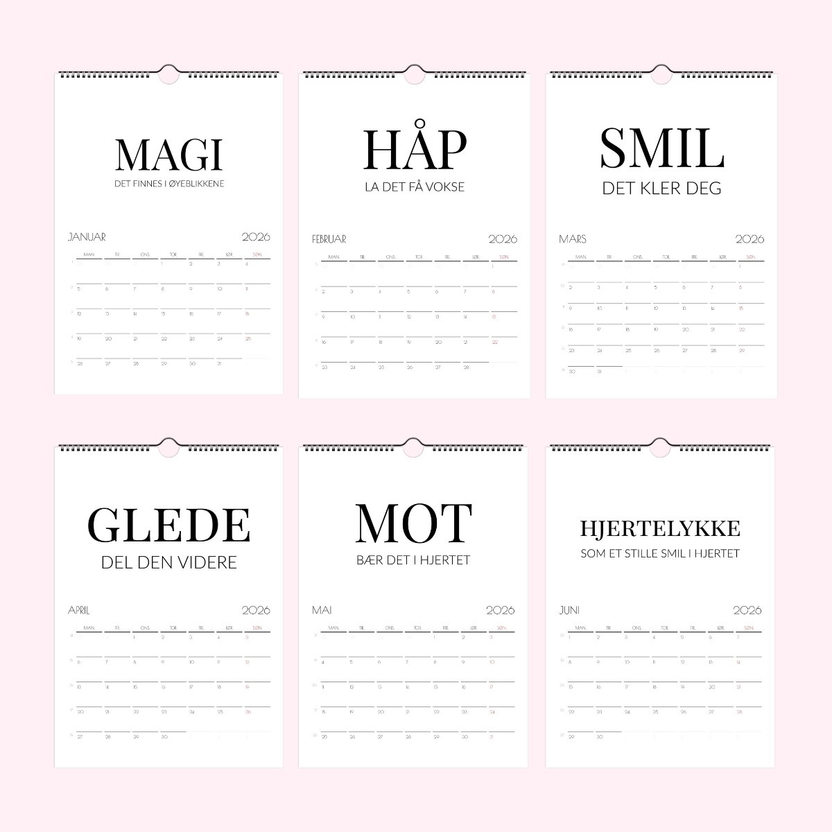 Denne vegghengte kalenderen følger deg gjennom 2026 med varsomme ord, små påminnelser og jevn ro i hverdagen. Hver måned løftes frem med et nytt budskap – om håp, glede, mot, varme og livsglede.
