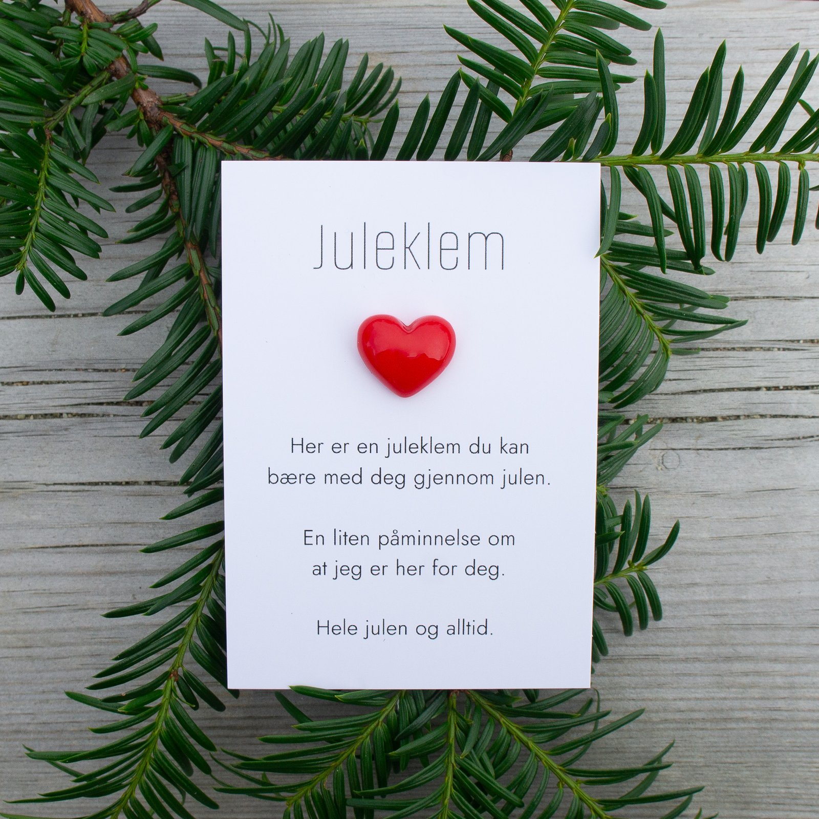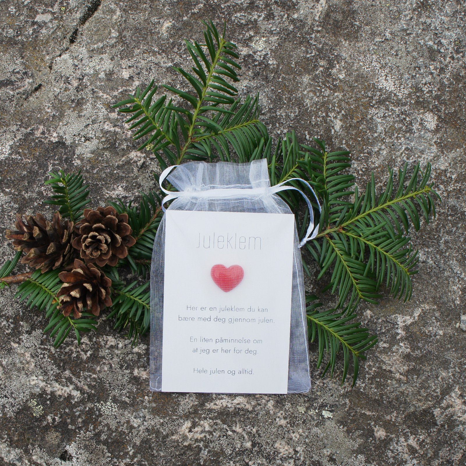 Denne søte lille Juleklemmen med rødt hjerte sprer varme og omtanke i førjulstiden.