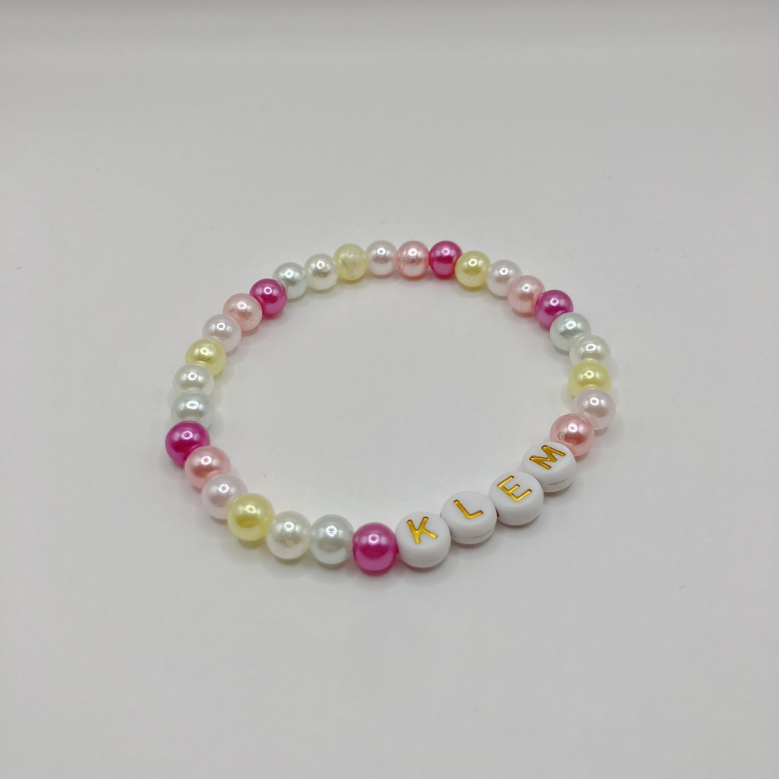Armbåndet er tredd på elastisk strikk og består av perler i myke, harmoniske farger.